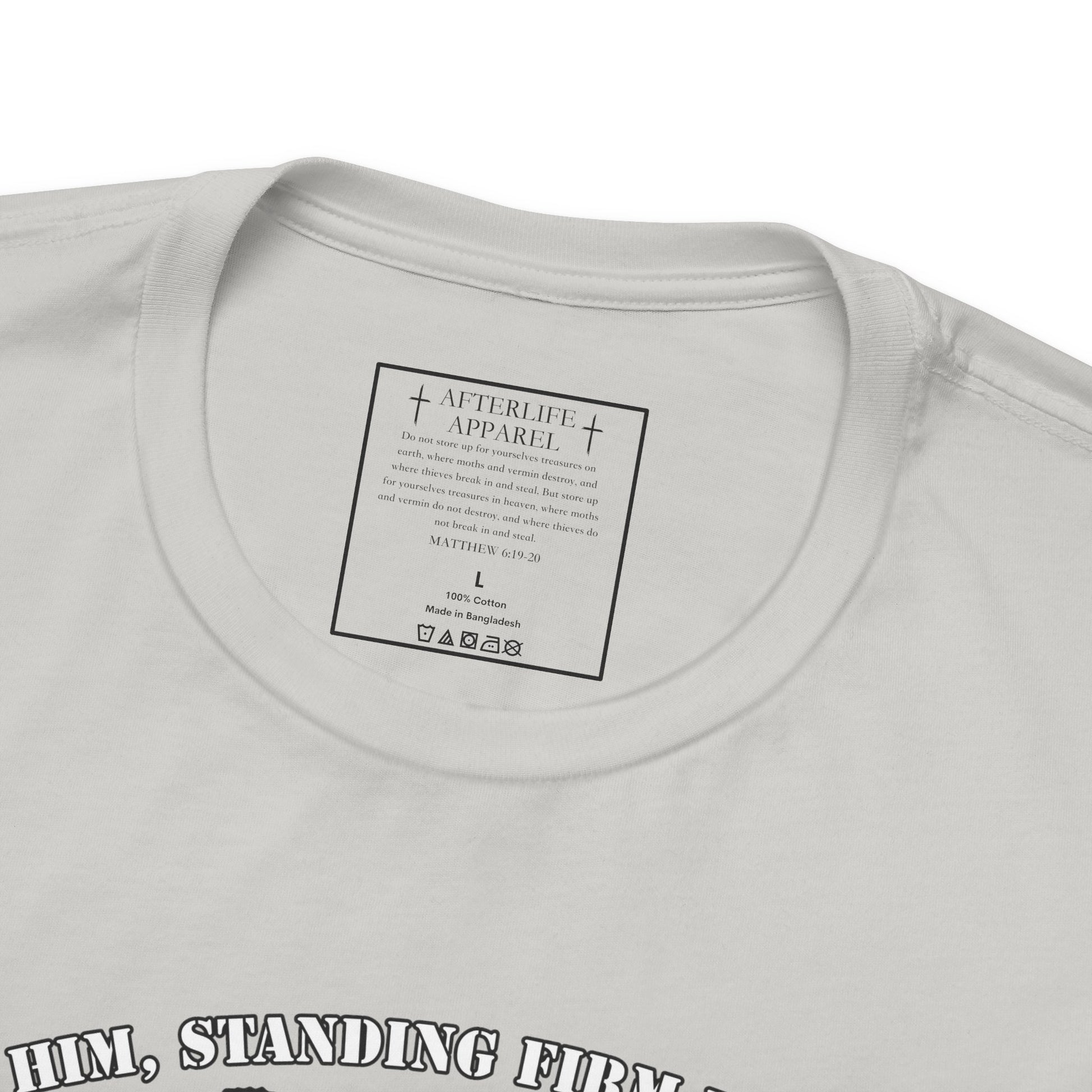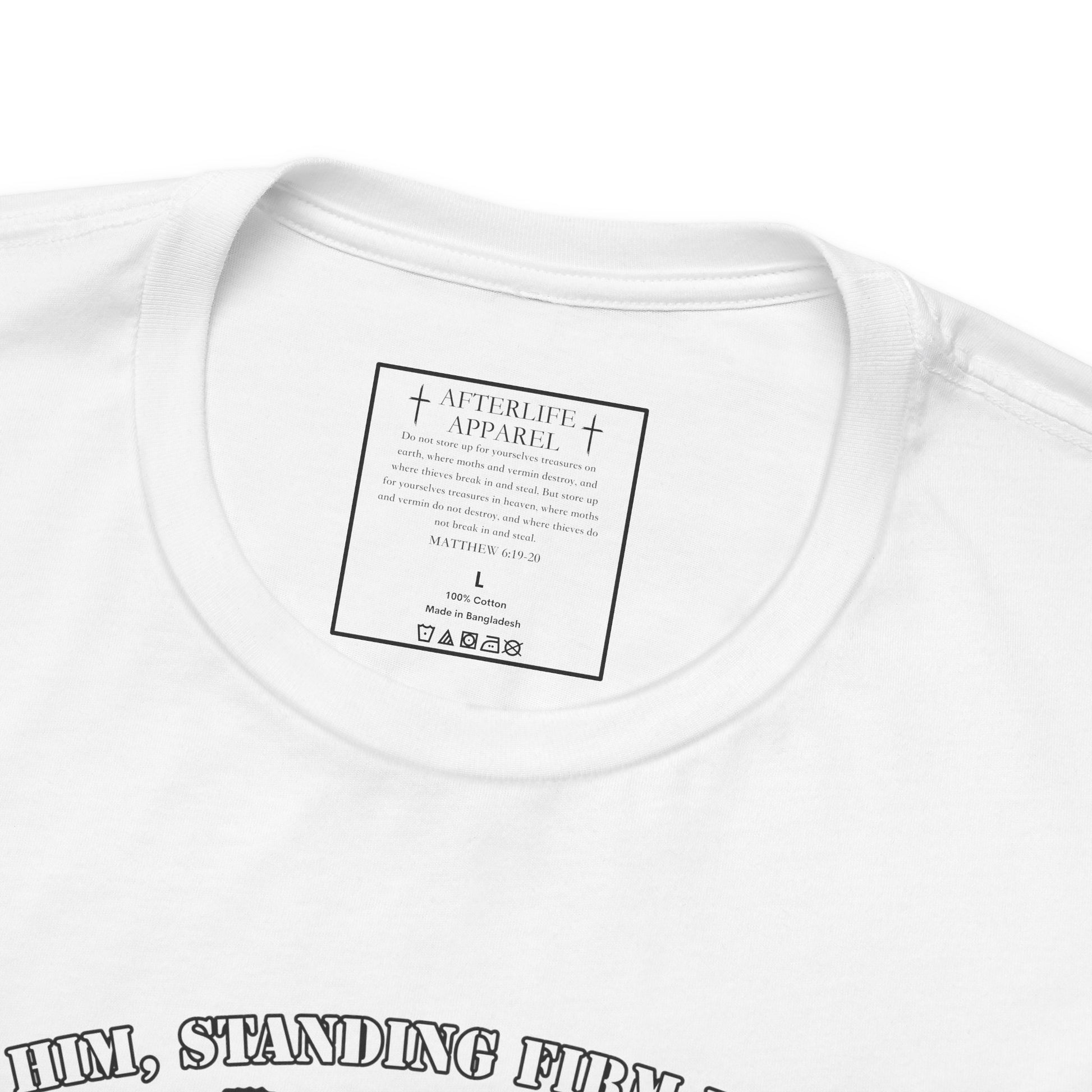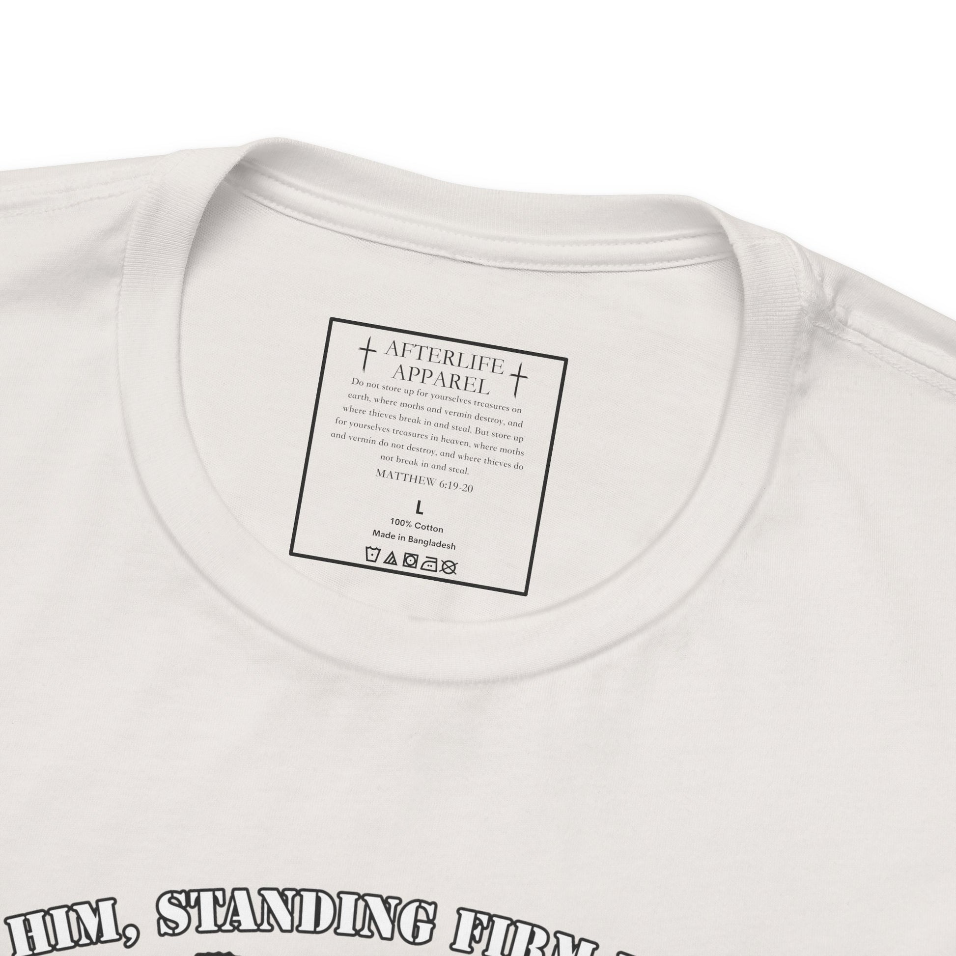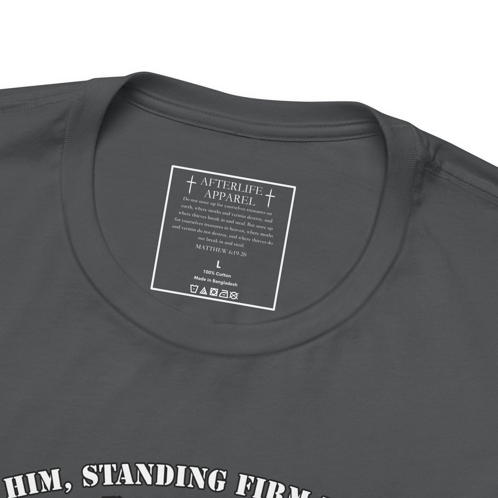 The inner shirt label has the verse from Matthew 6:19-20 "19 “Don’t store up treasures here on earth, where moths eat them and rust destroys them, and where thieves break in and steal. 20Store your treasures in heaven, where moths and rust cannot destroy, and thieves do not break in and steal."