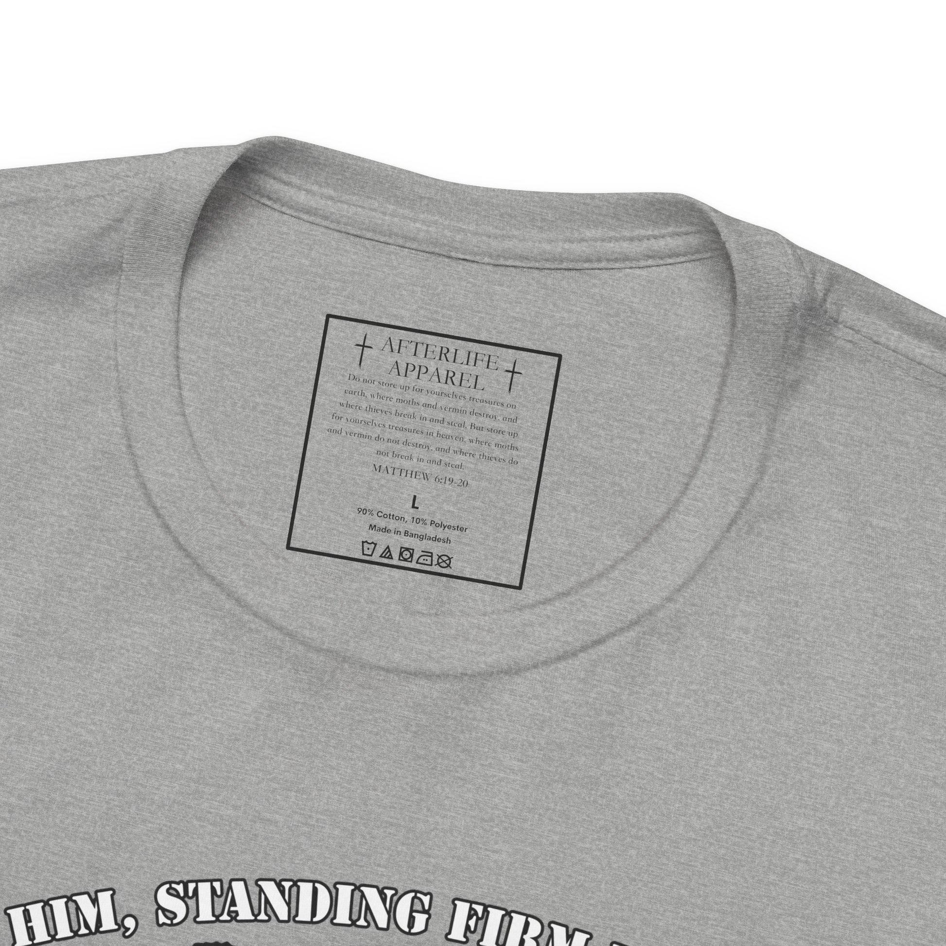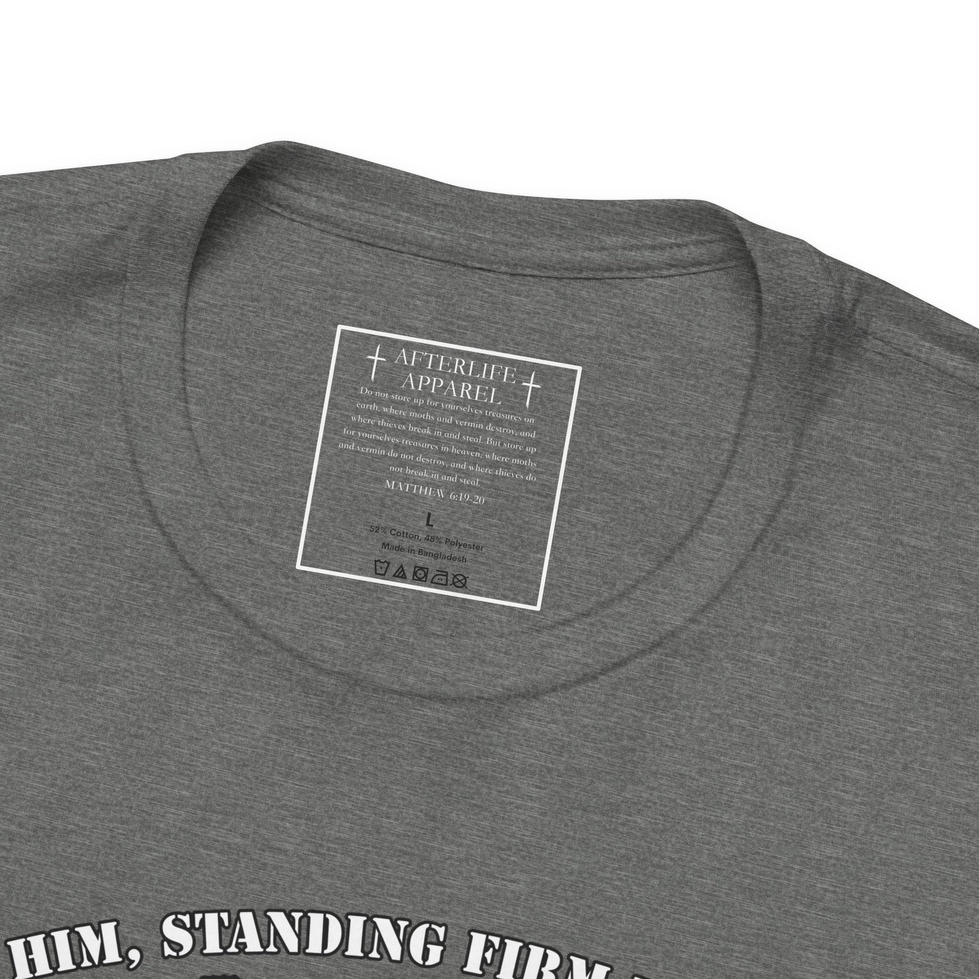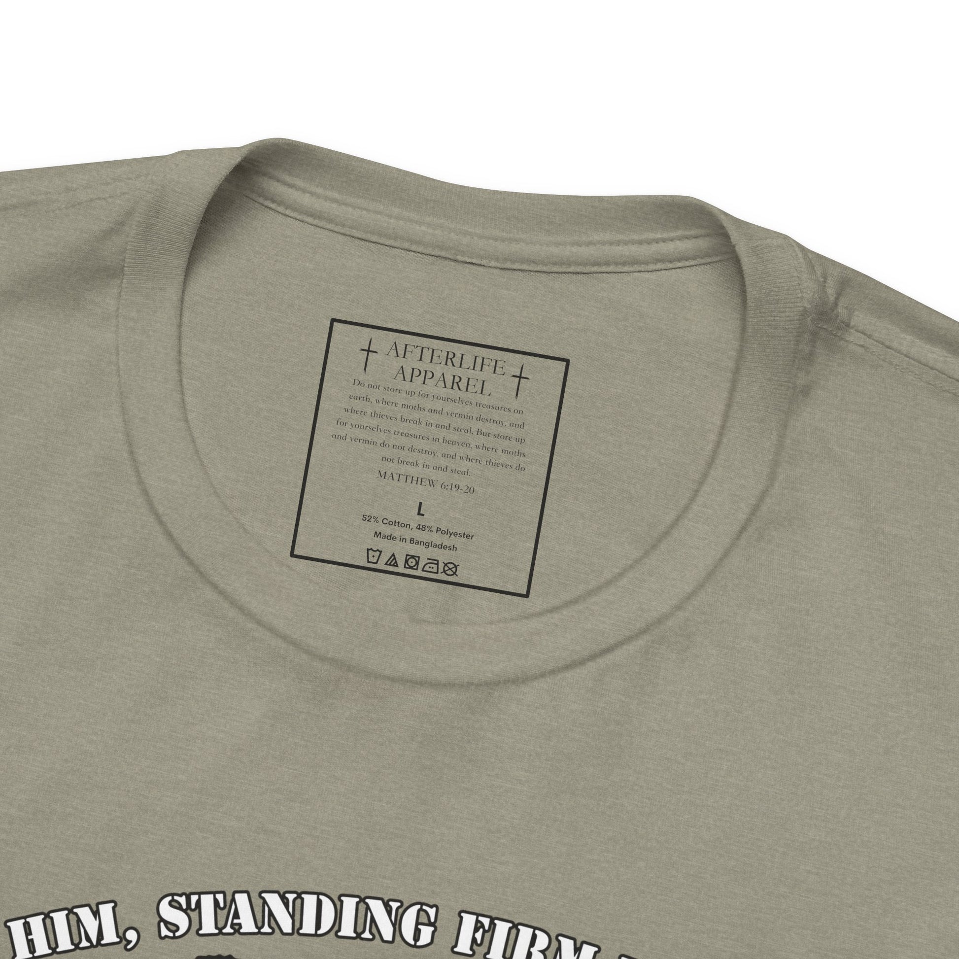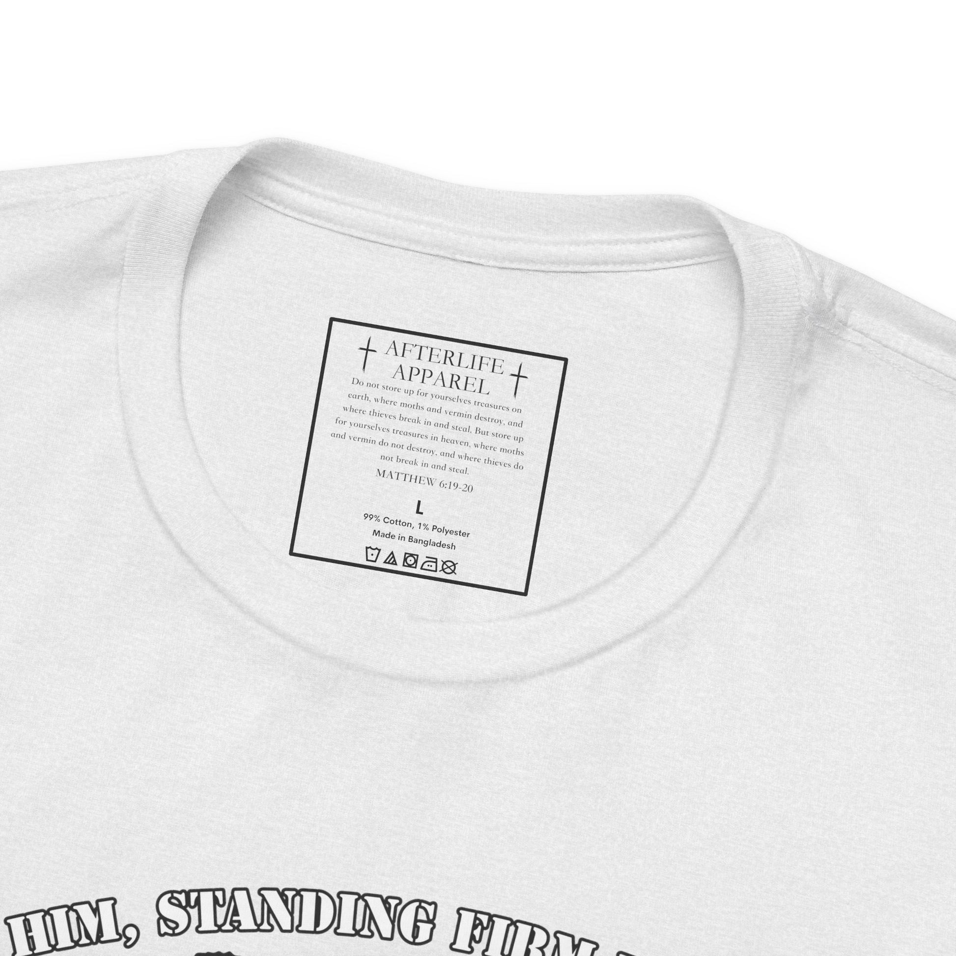 The inner shirt label has the verse from Matthew 6:19-20 "19 “Don’t store up treasures here on earth, where moths eat them and rust destroys them, and where thieves break in and steal. 20Store your treasures in heaven, where moths and rust cannot destroy, and thieves do not break in and steal."