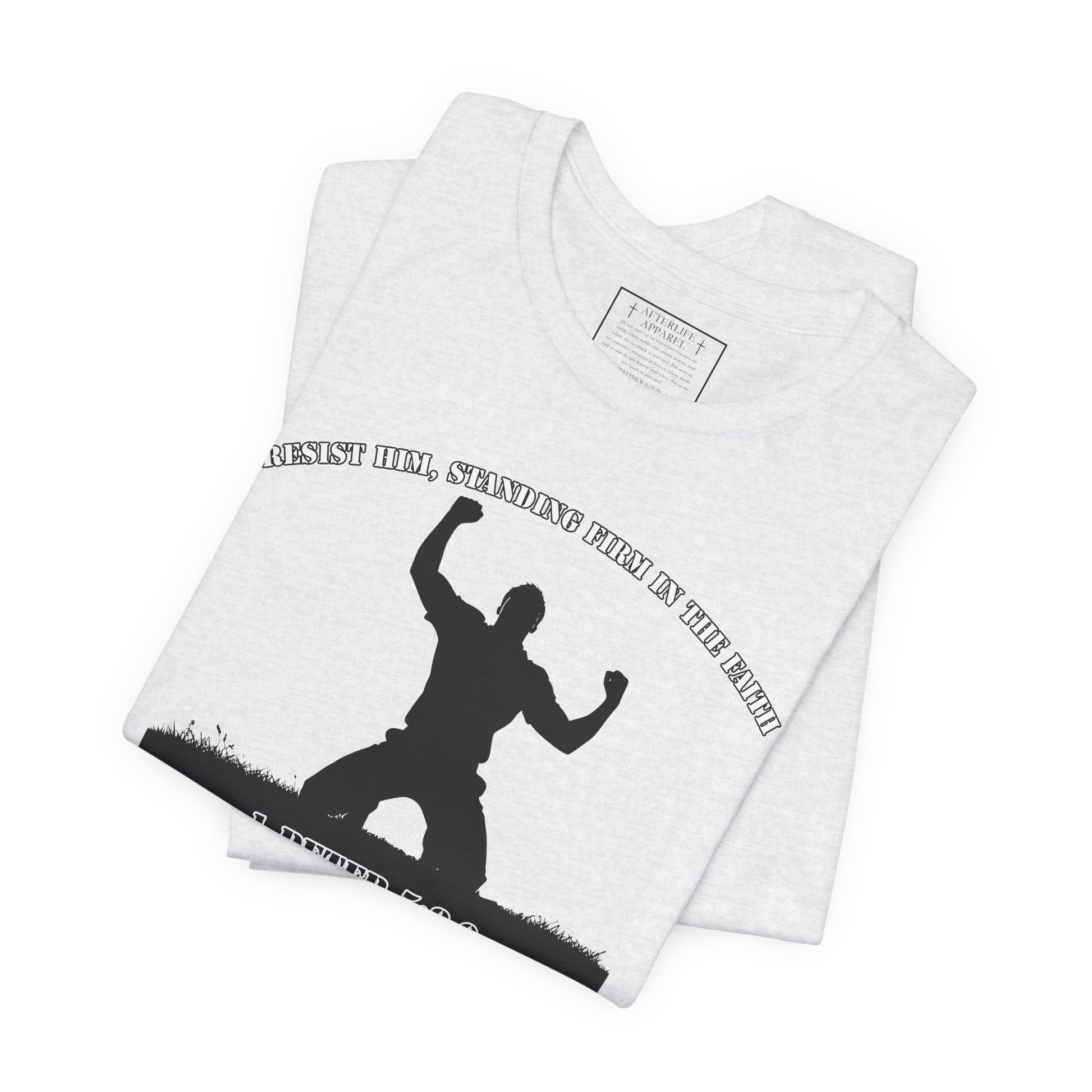 This very cool graphic T-Shirt is a paraphrase of 1 Peter 5:8-9 "Stay alert! Watch out for your great enemy, the devil. He prowls around like a roaring lion, looking for someone to devour. Stand firm against him, and be strong in your faith. Remember that your family of believers all over the world is going through the same kind of suffering you are."