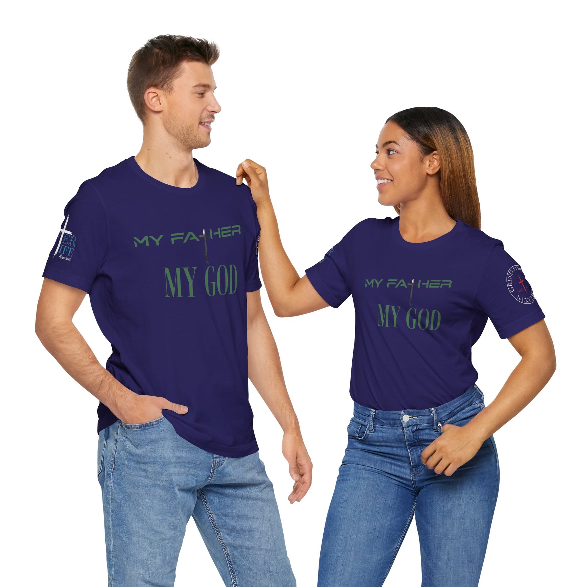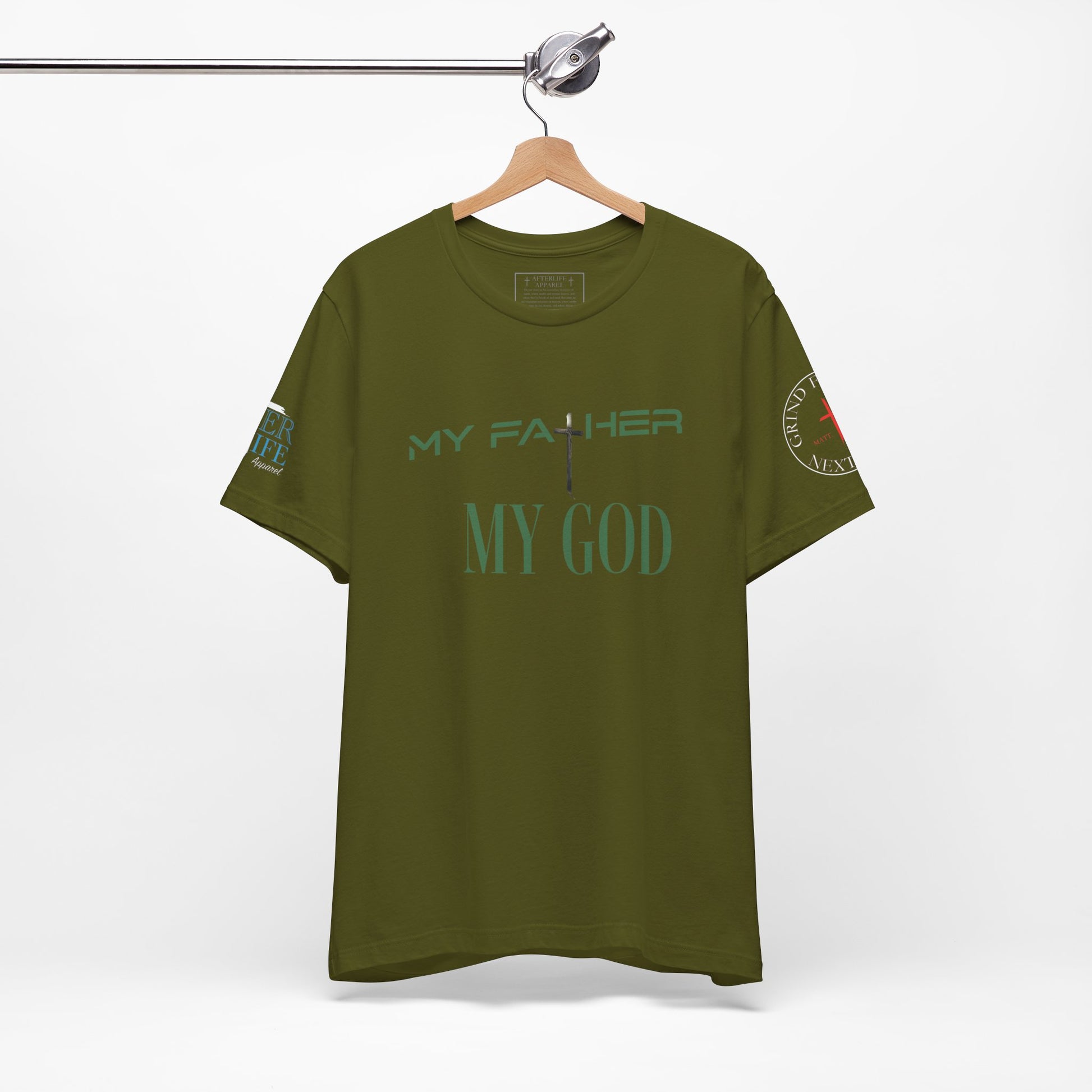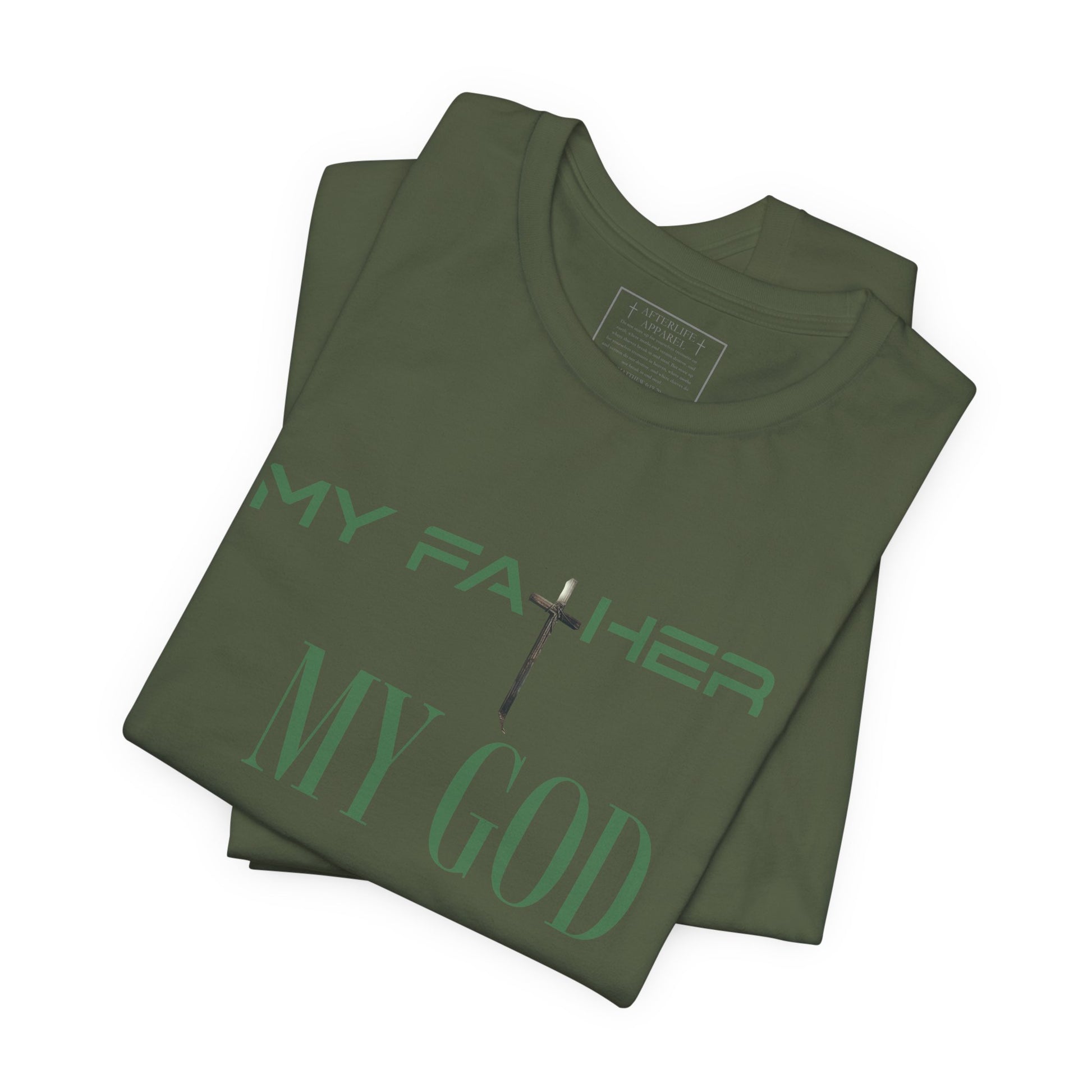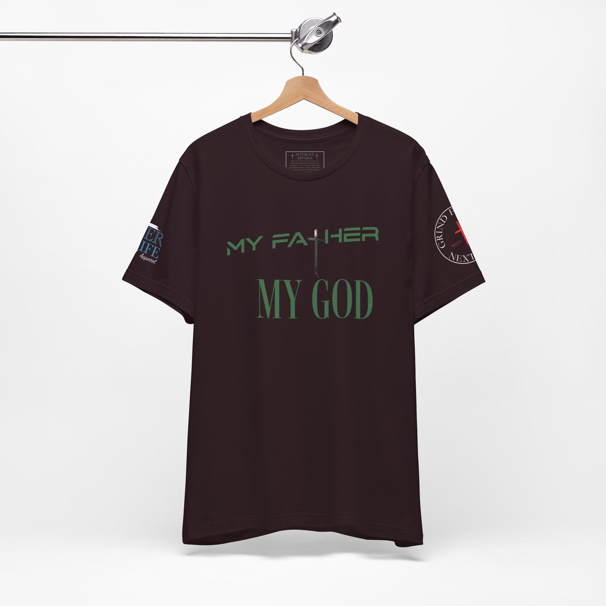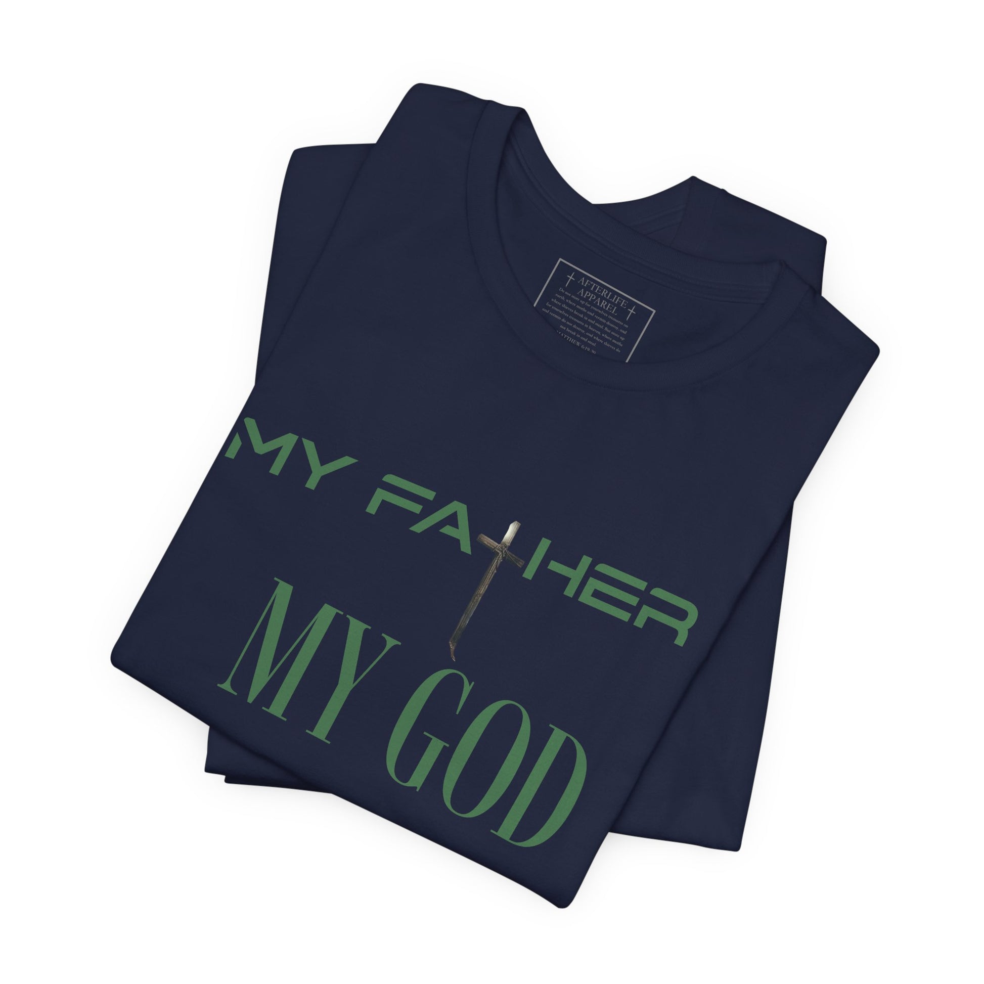 A short sleeve tee featuring the design 'My Father My God'. This tee offers a casual and classic look, perfect for everyday wear and errands. It is made with 100% Airlume combed and ring-spun cotton, making it lightweight and breathable for active or leisure wear. Boldly state your faith!