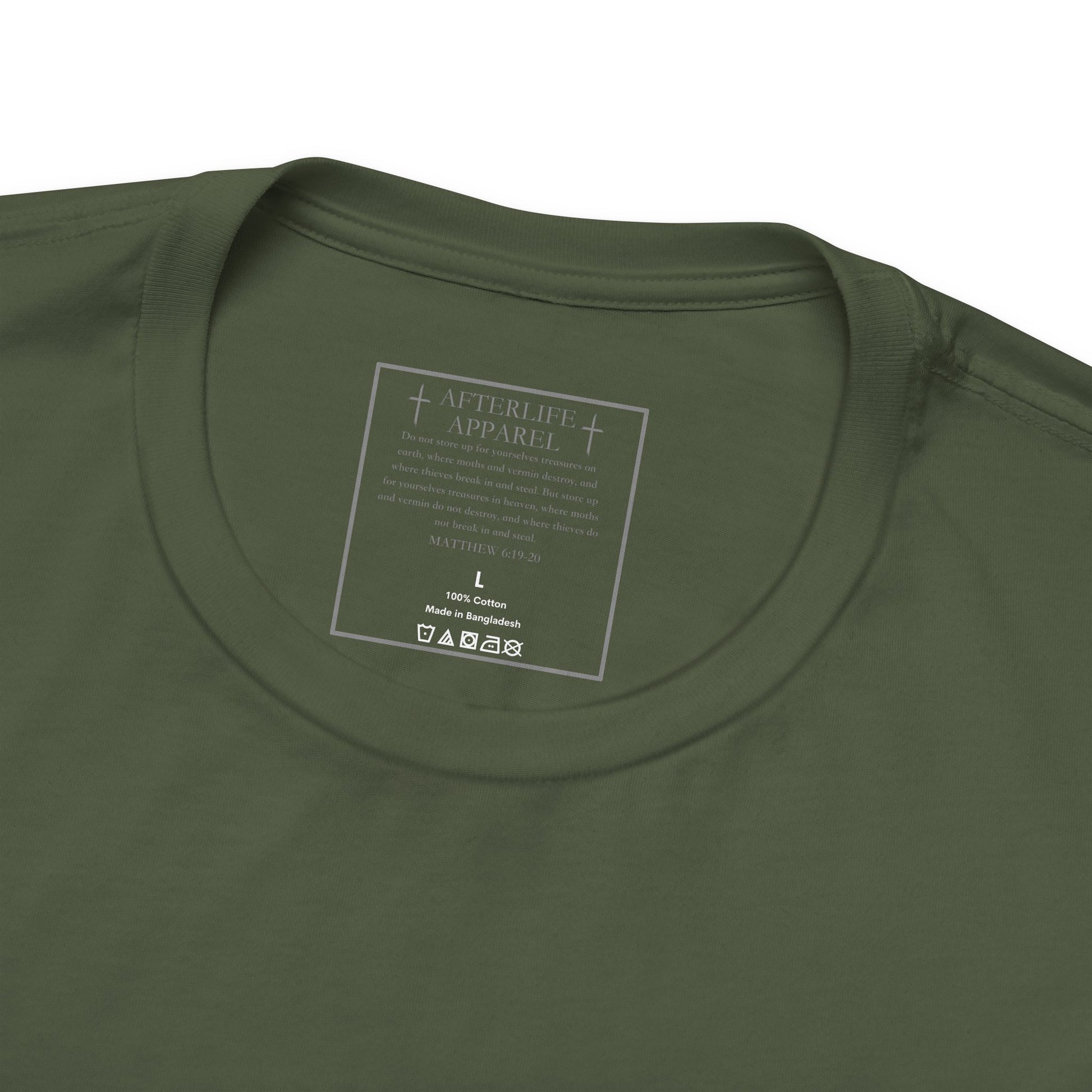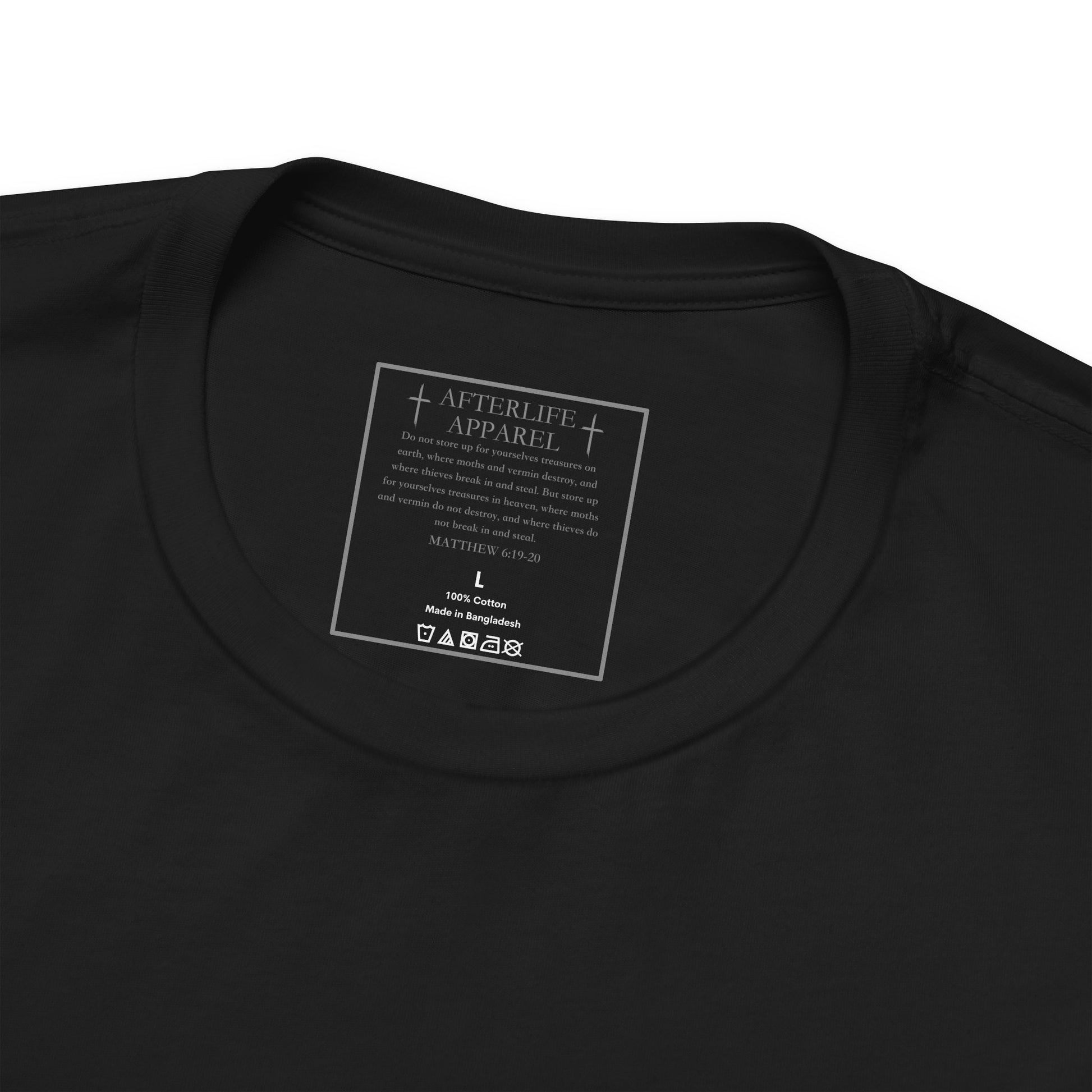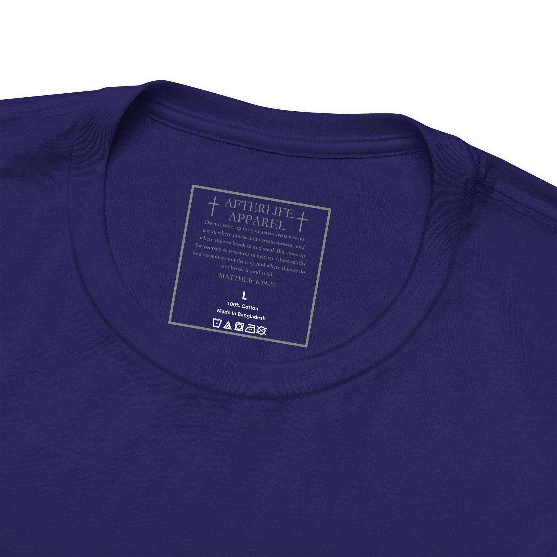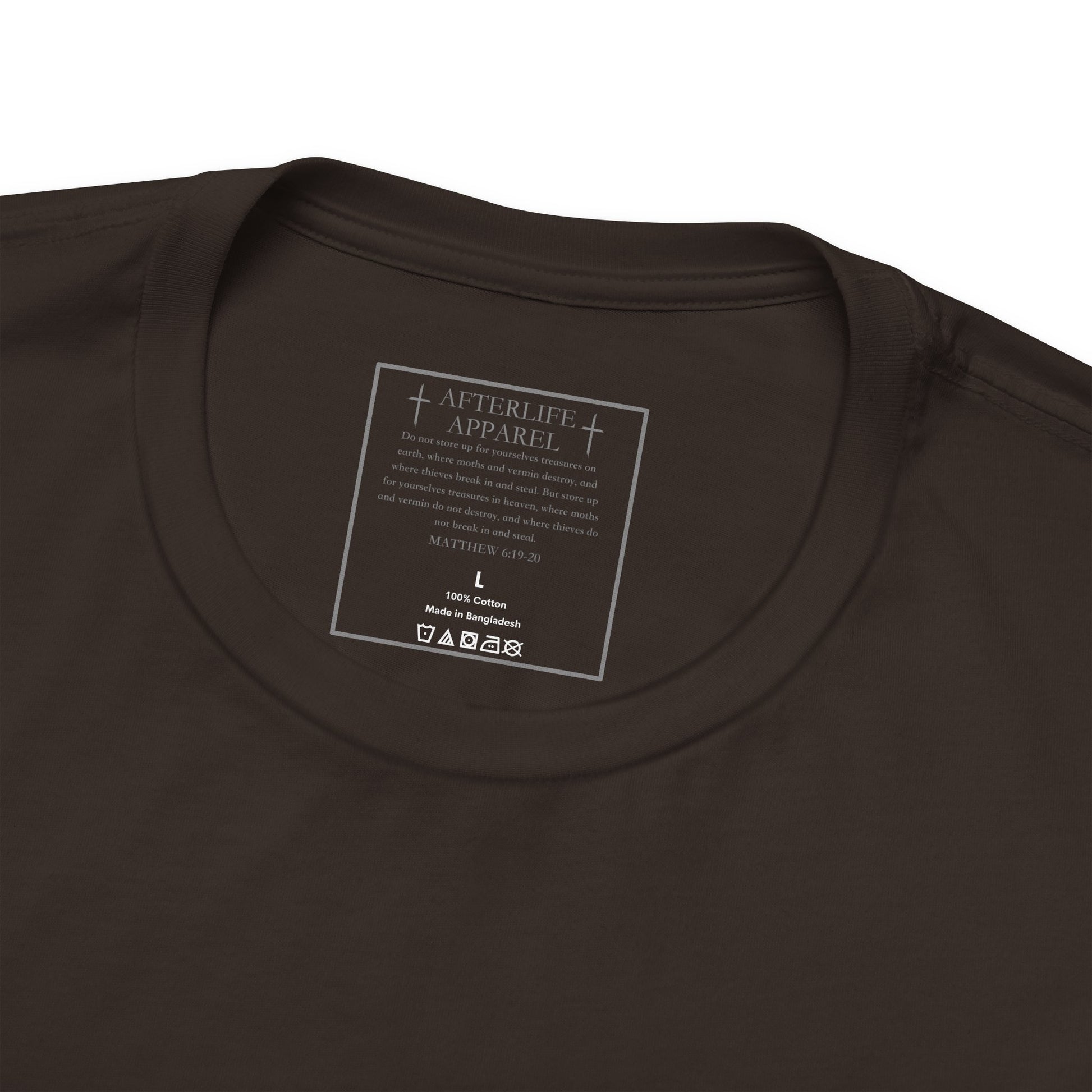 The inner shirt label has the verse from Matthew 6:19-20 "19 “Don’t store up treasures here on earth, where moths eat them and rust destroys them, and where thieves break in and steal. 20Store your treasures in heaven, where moths and rust cannot destroy, and thieves do not break in and steal."