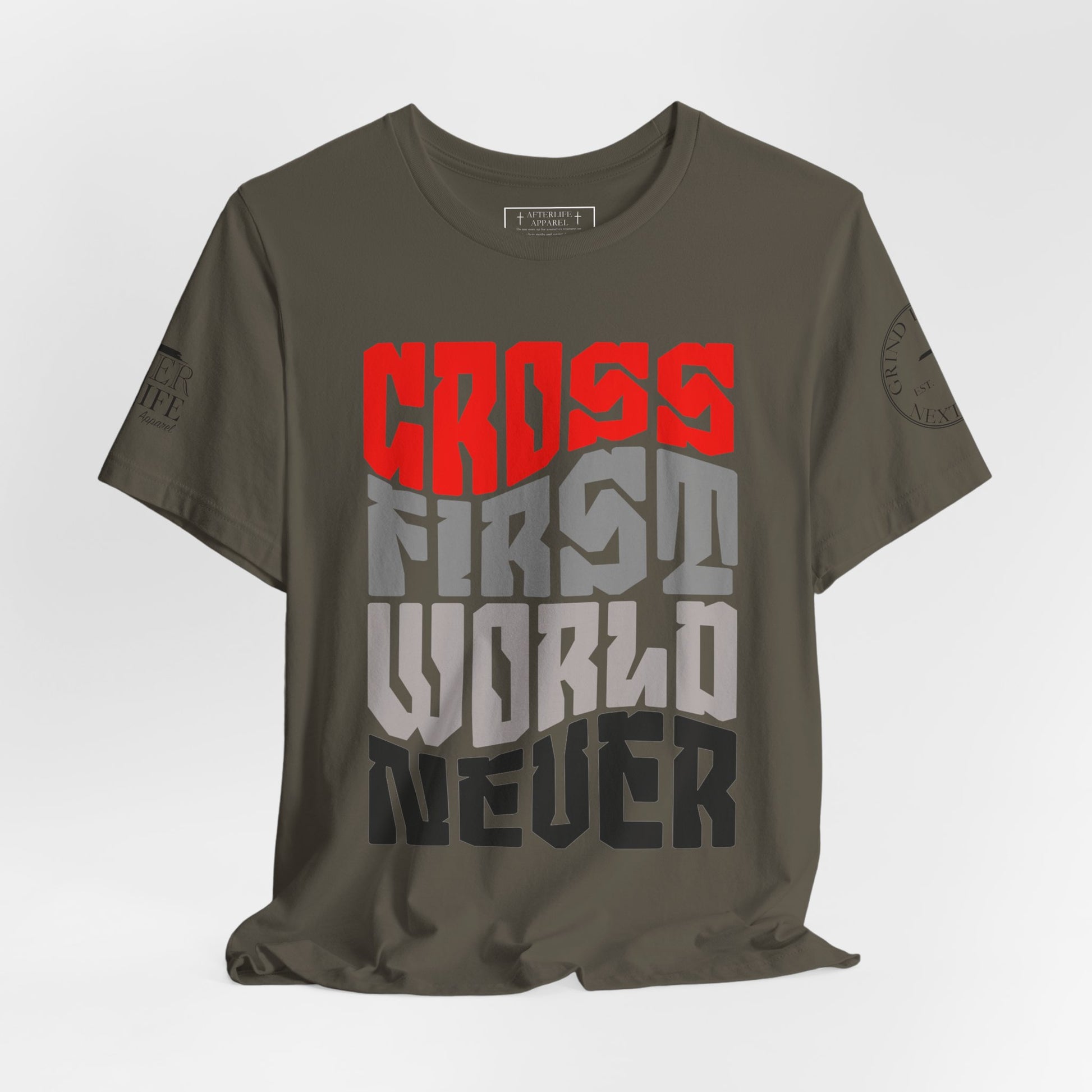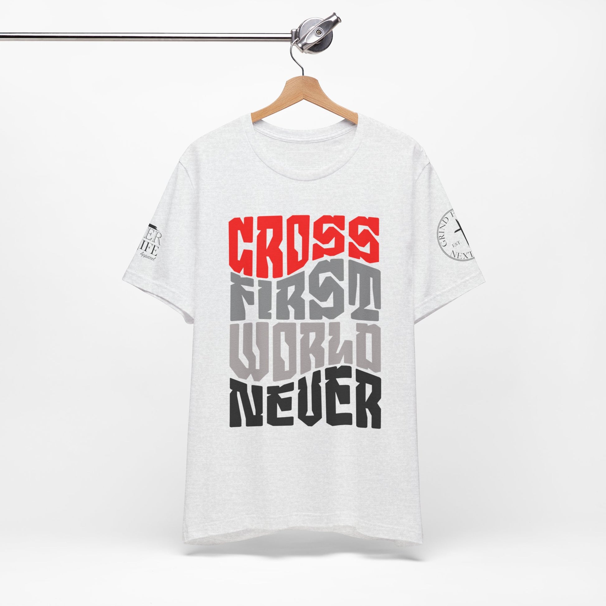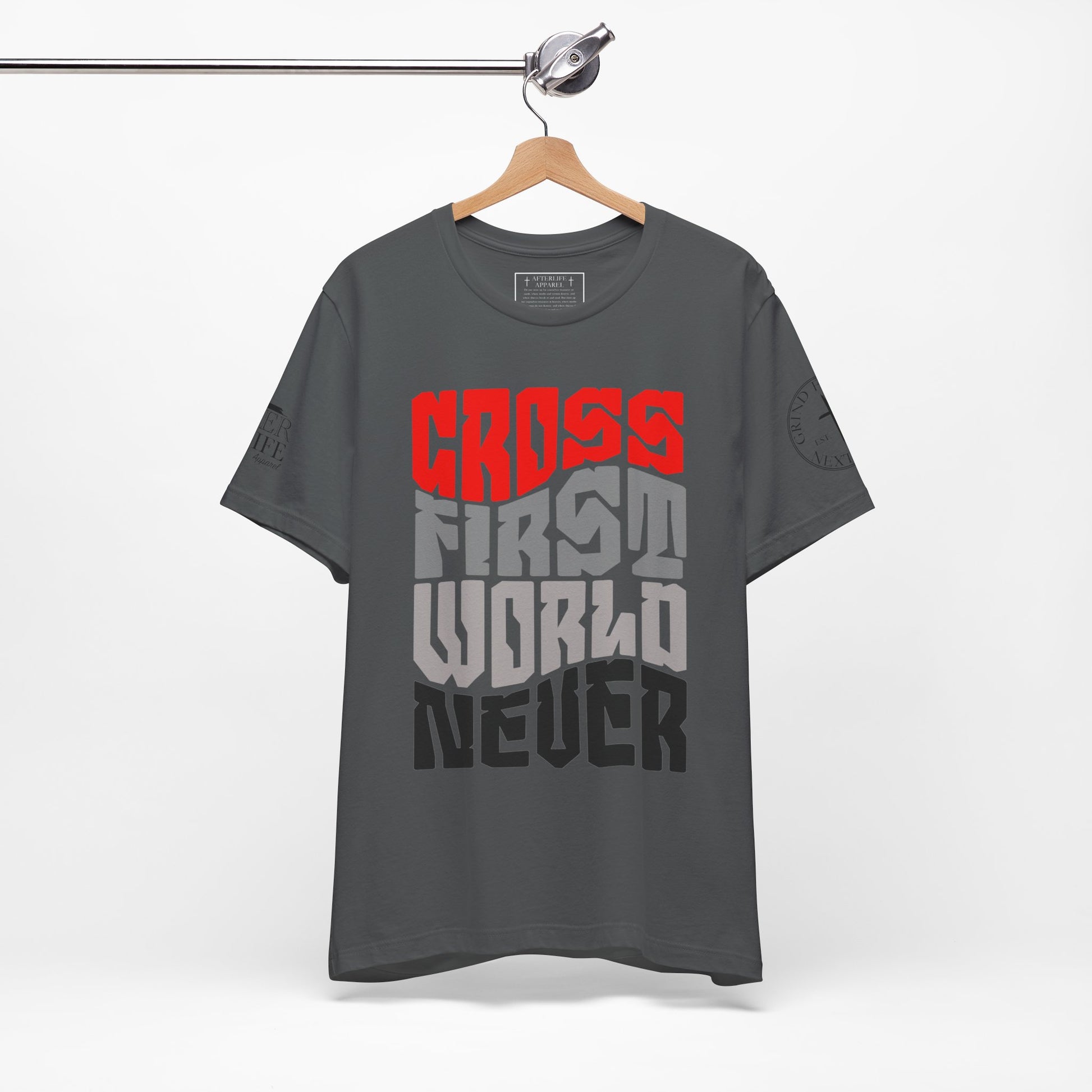 "Cross First, World Never: A bold declaration to prioritize Christ above all else. Wear your faith unapologetically."