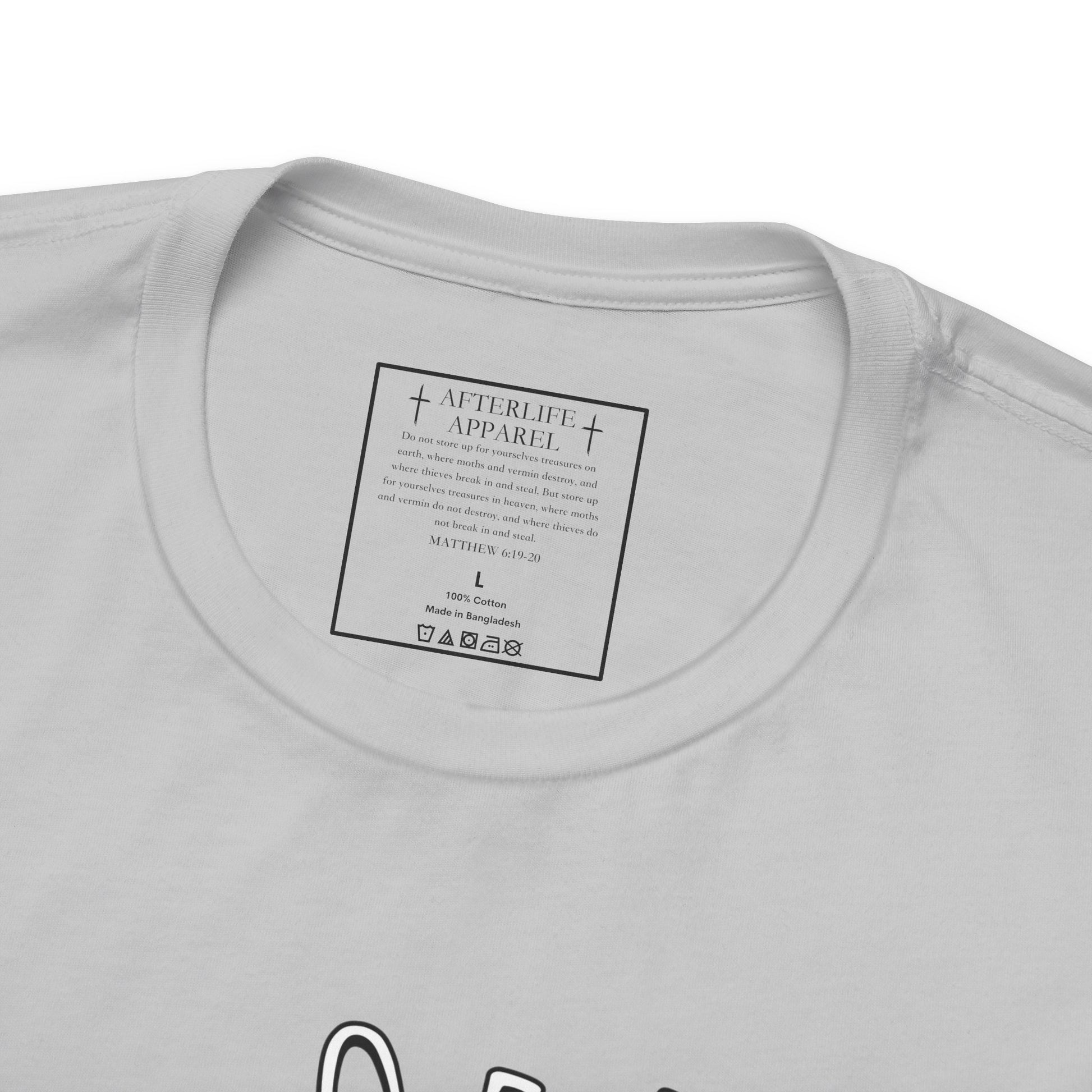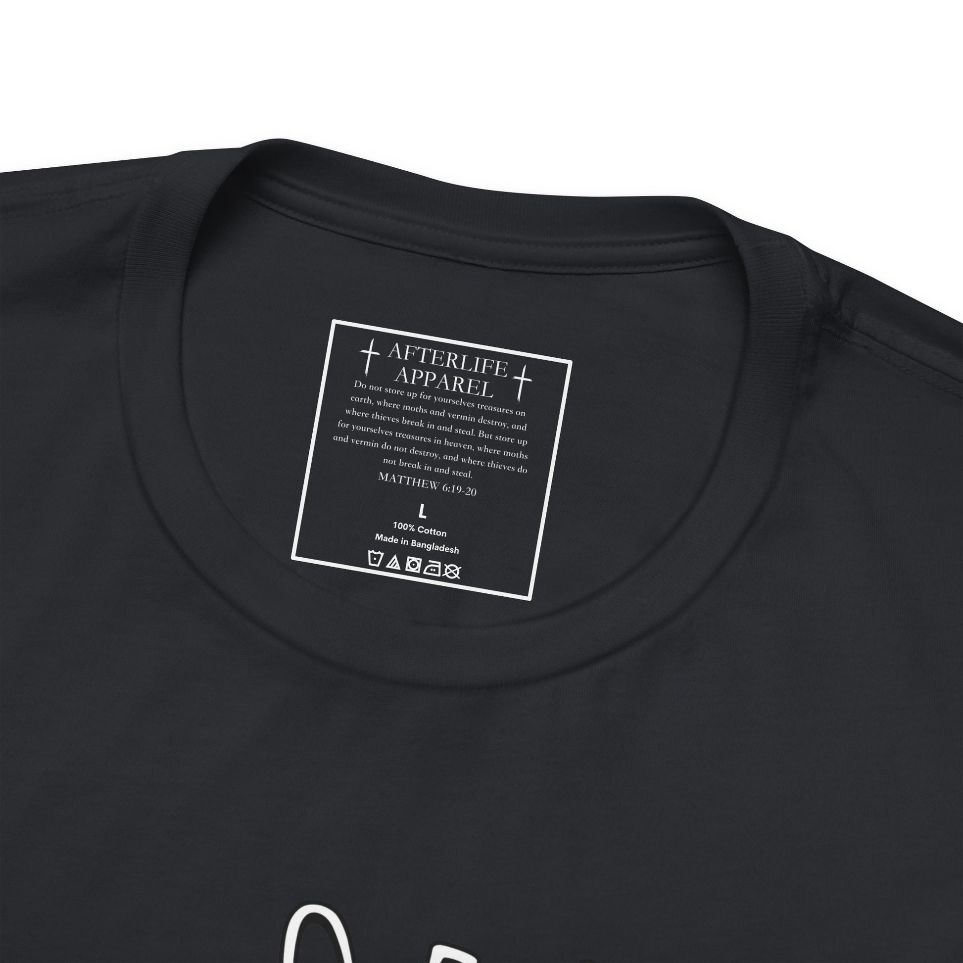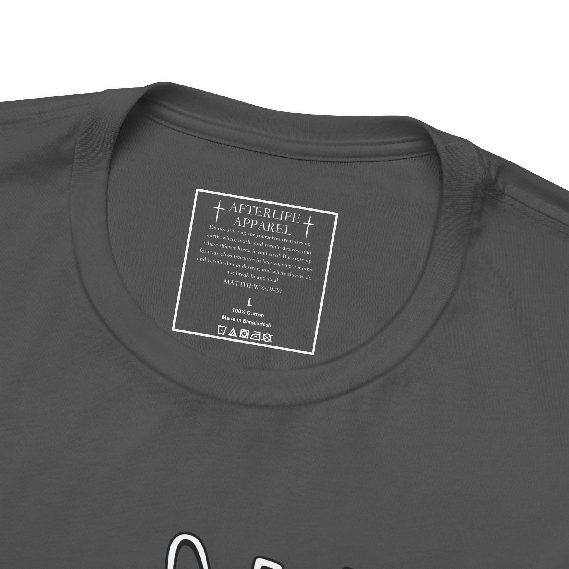 The inner shirt label has the verse from Matthew 6:19-20 "19 “Don’t store up treasures here on earth, where moths eat them and rust destroys them, and where thieves break in and steal. 20Store your treasures in heaven, where moths and rust cannot destroy, and thieves do not break in and steal."