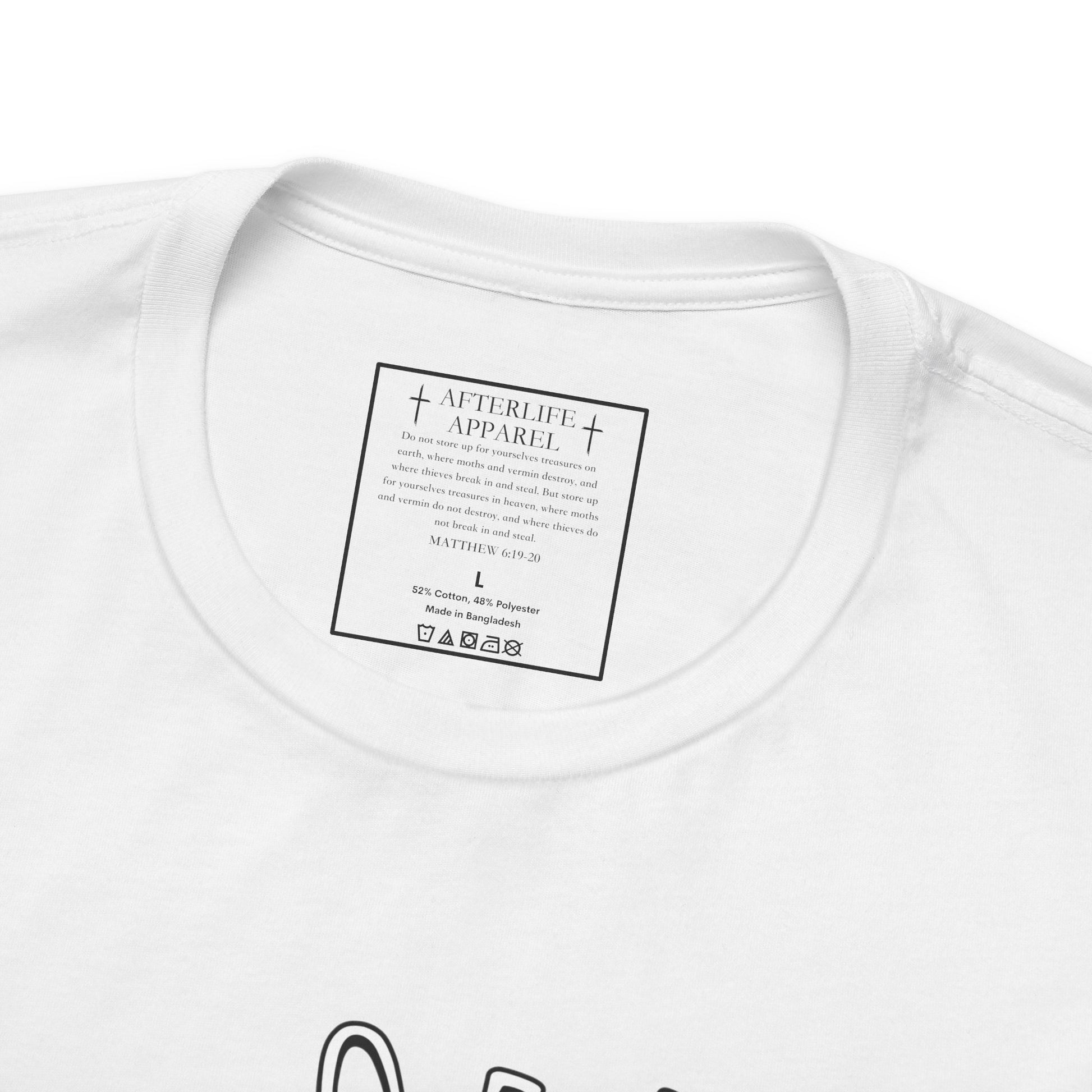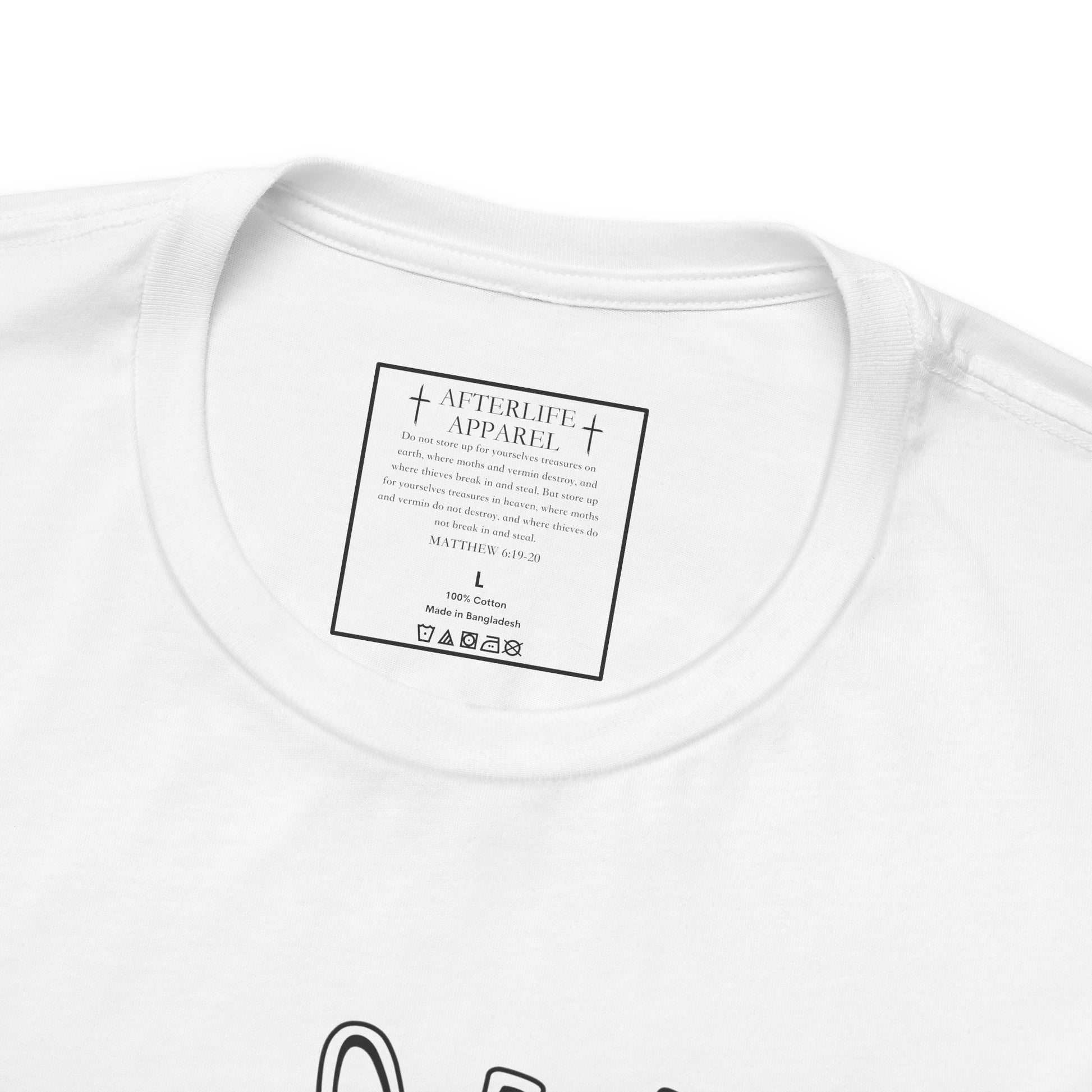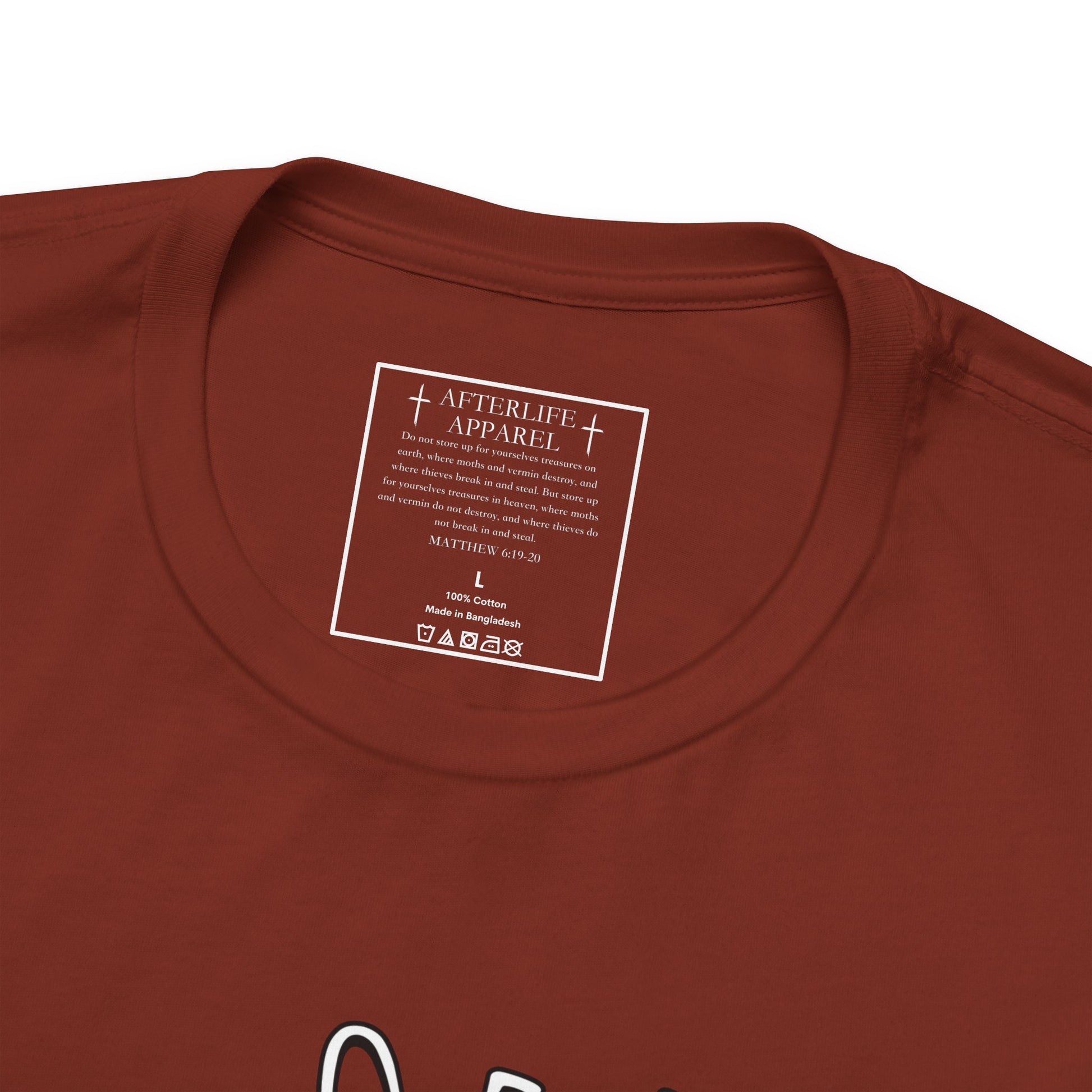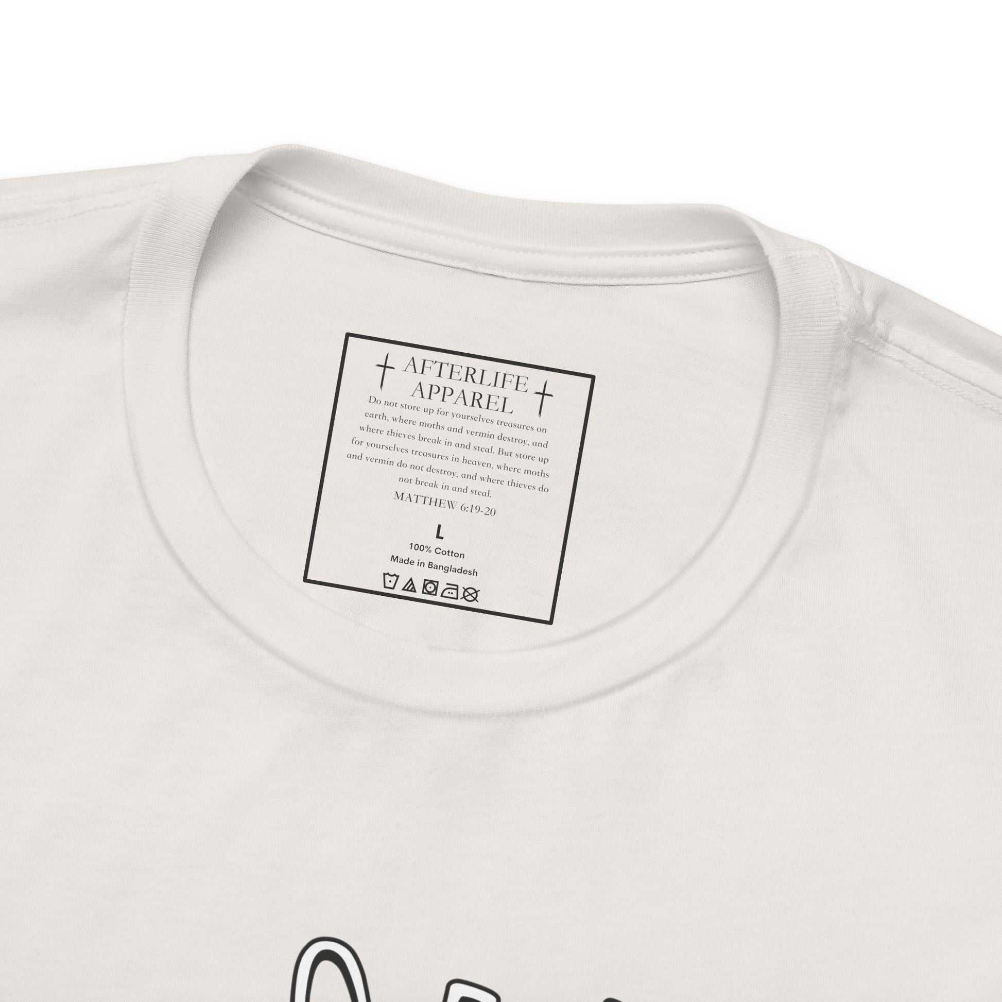 The inner shirt label has the verse from Matthew 6:19-20 "19 “Don’t store up treasures here on earth, where moths eat them and rust destroys them, and where thieves break in and steal. 20Store your treasures in heaven, where moths and rust cannot destroy, and thieves do not break in and steal."